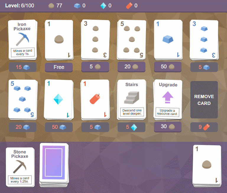 Mine Cards is an idle deckbuilding game. Gather resources and buy cards to improve your deck and reach level 100 of the mine!